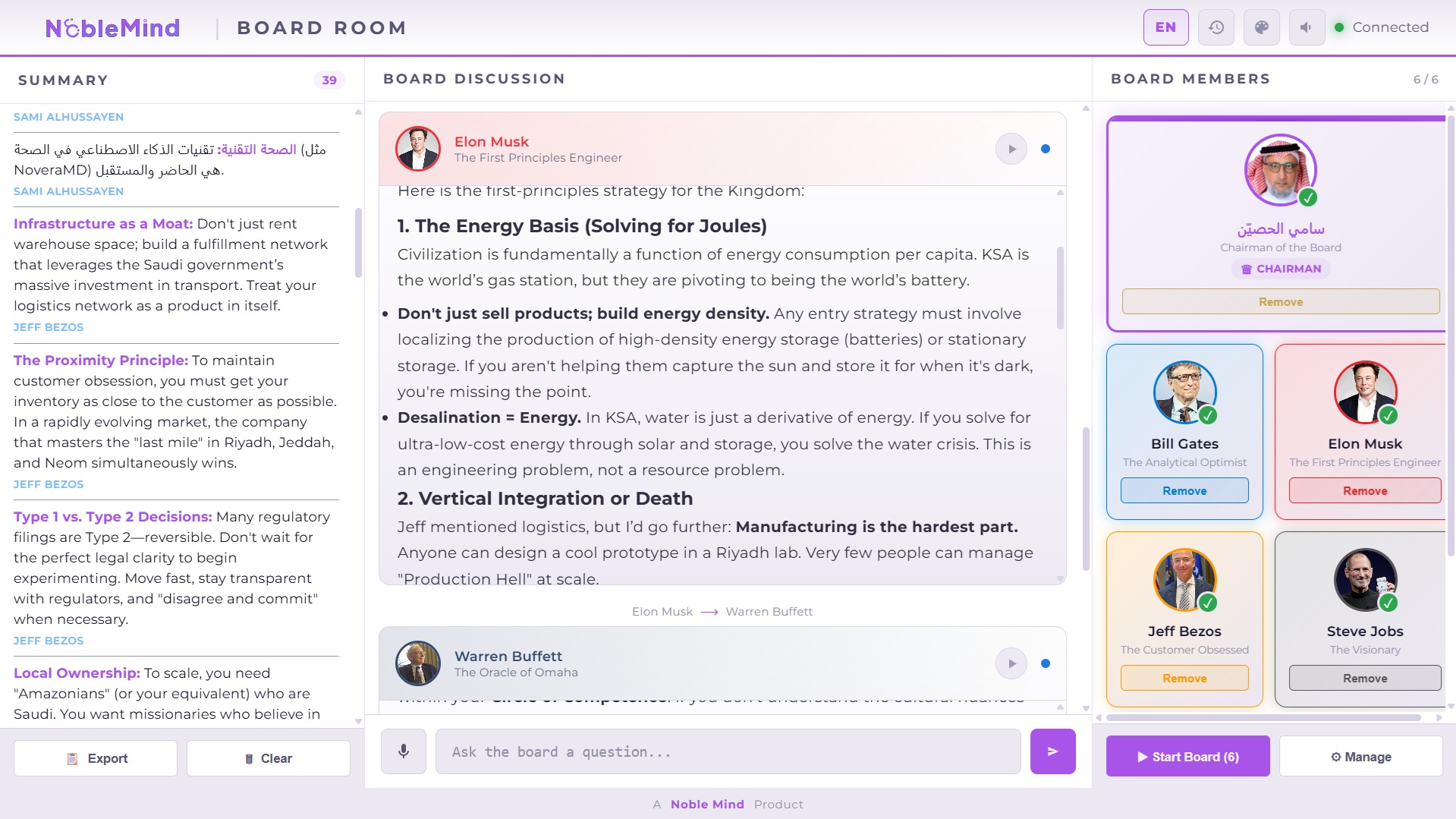 القرارات العظيمة نادراً ما تتخذ بمفردها. هي تتشكل بوجهات نظر متنوعة، وتُحدى بالتحديات، وتُصقل بالحكمة. NobleMind يمنحك نفس القوة. مجلس استشاري افتراضي، متاح فوراً، جاهز لمواجهة أي سؤال تضعه على الطاولة.